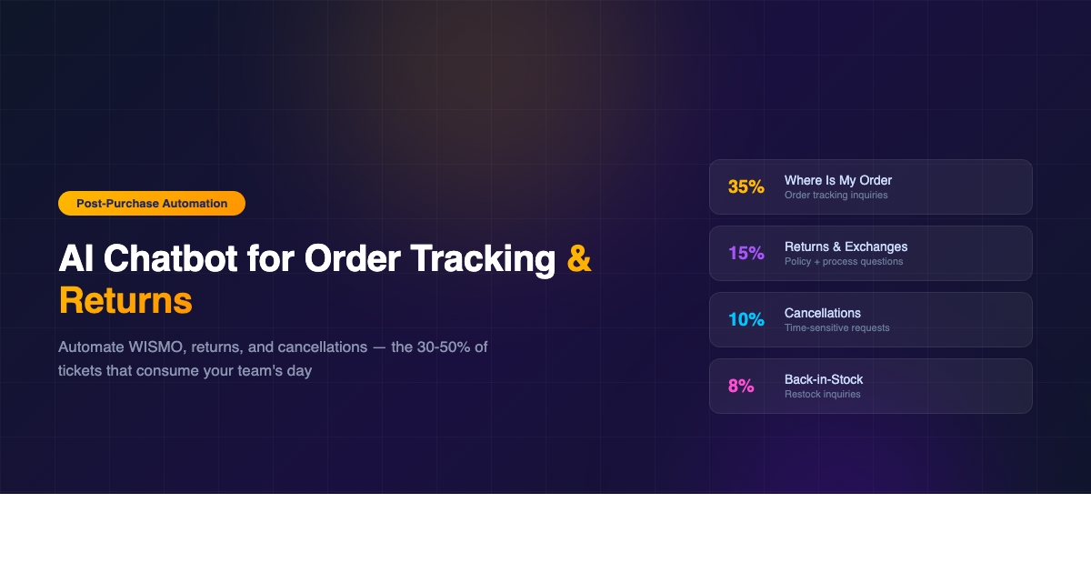 A Shopify order tracking chatbot handles the post-purchase questions that account for 30-50% of all ecommerce support tickets. That share is not an outlier. Across verticals and store sizes, “Where is my order?” and its close relatives, “How do I return this?” and “Can I cancel?”, are the most common questions your support team answers. They are also the ones that require the least human judgment. Every answer is deterministic: pull the order record, check the status, apply the policy. If a chatbot can do that reliably, your team stops doing it manually dozens of times a day.