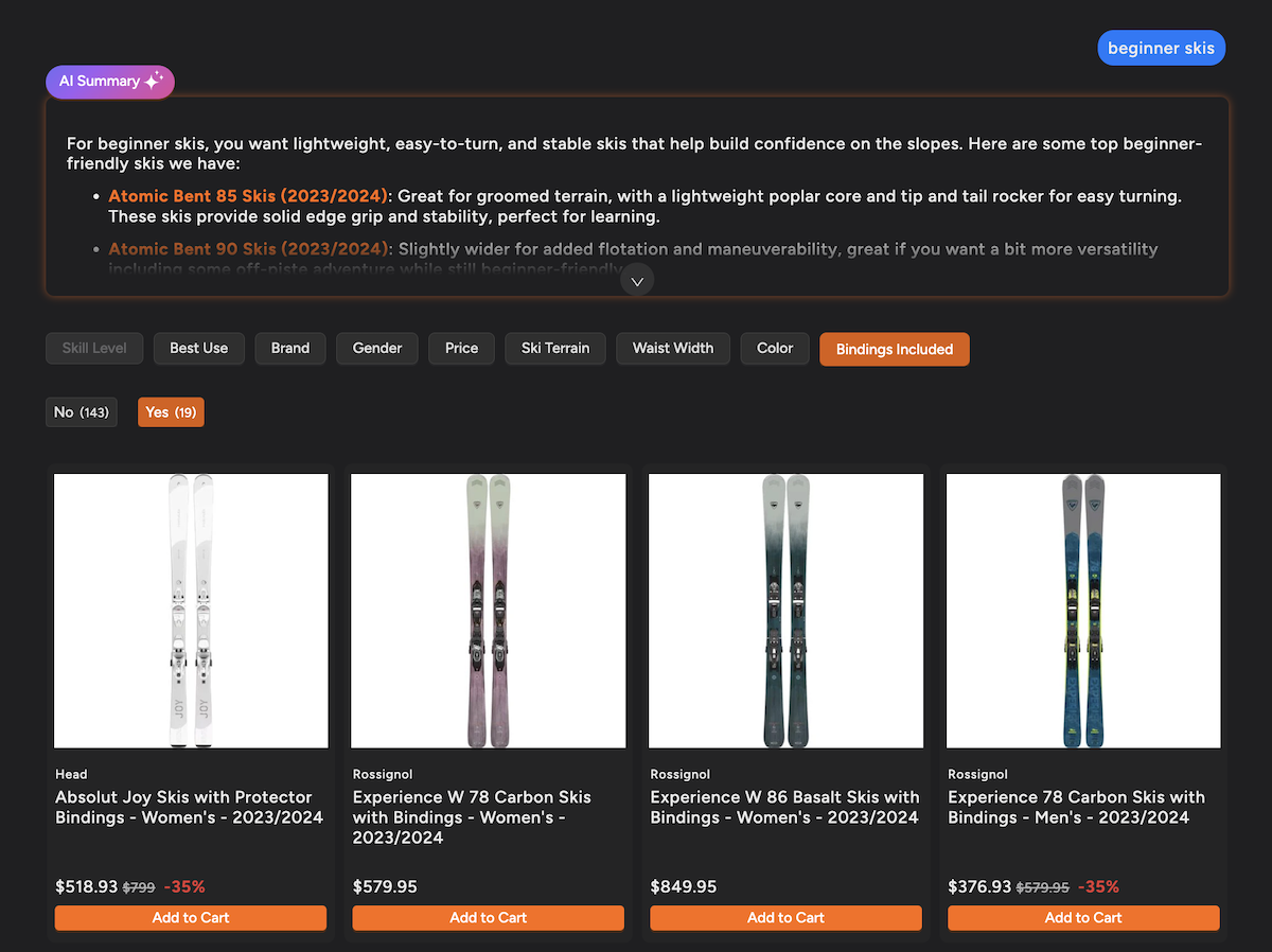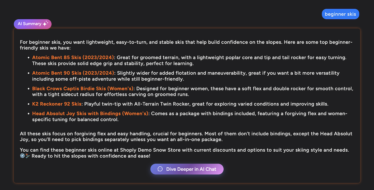 For example: https://demo.shoplyai.ai/search?q=beginner+skis&search_engine=shoply