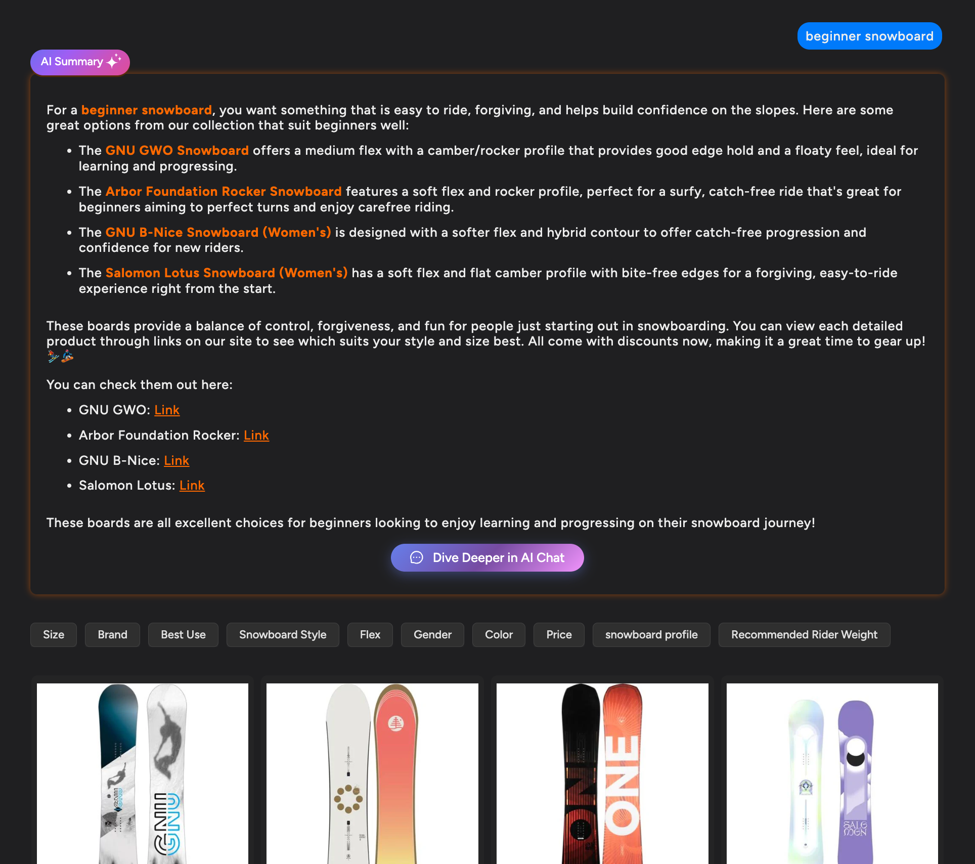 - Customer searches for “beginner snowboard”