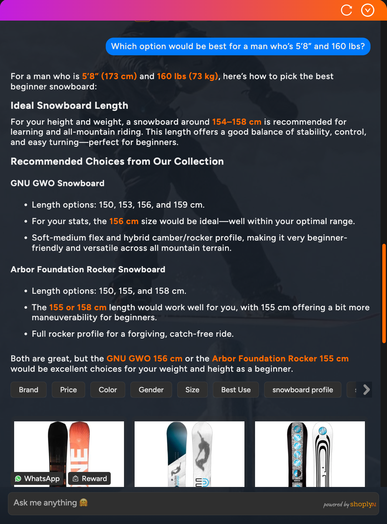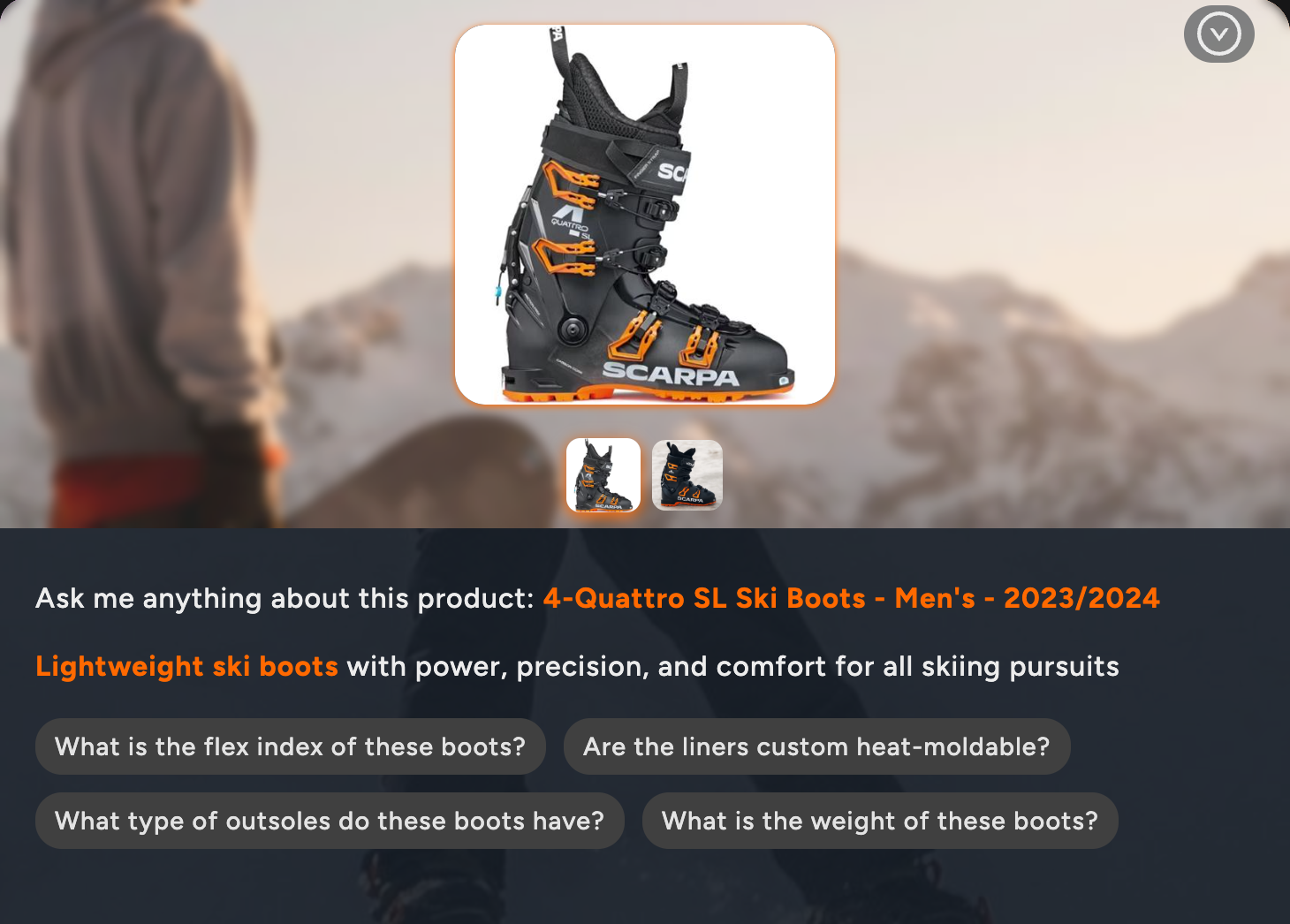 https://demo.shoplyai.ai/products/quattro-ski-boots#shoply_product_questionsThis opens the AI chatbot pre-loaded with relevant product FAQs, giving customers instant answers about the specific item they’re viewing.
