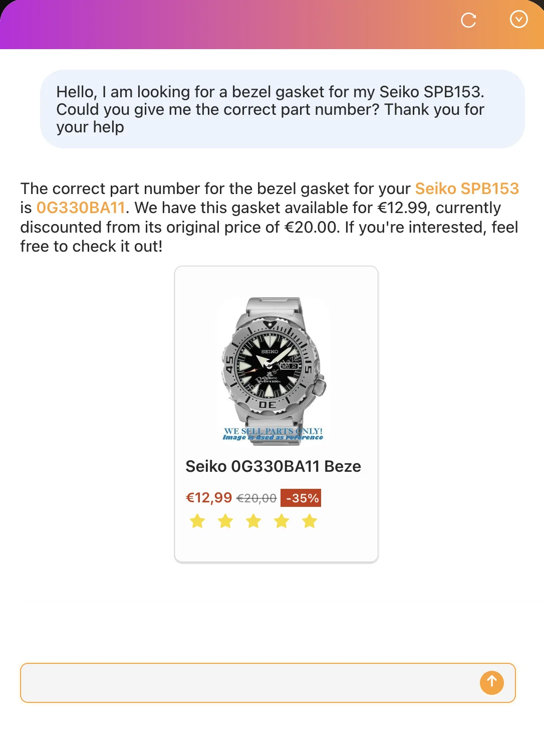 - “Can you give me the correct part number for a bezel gasket for my Seiko SPB153?”